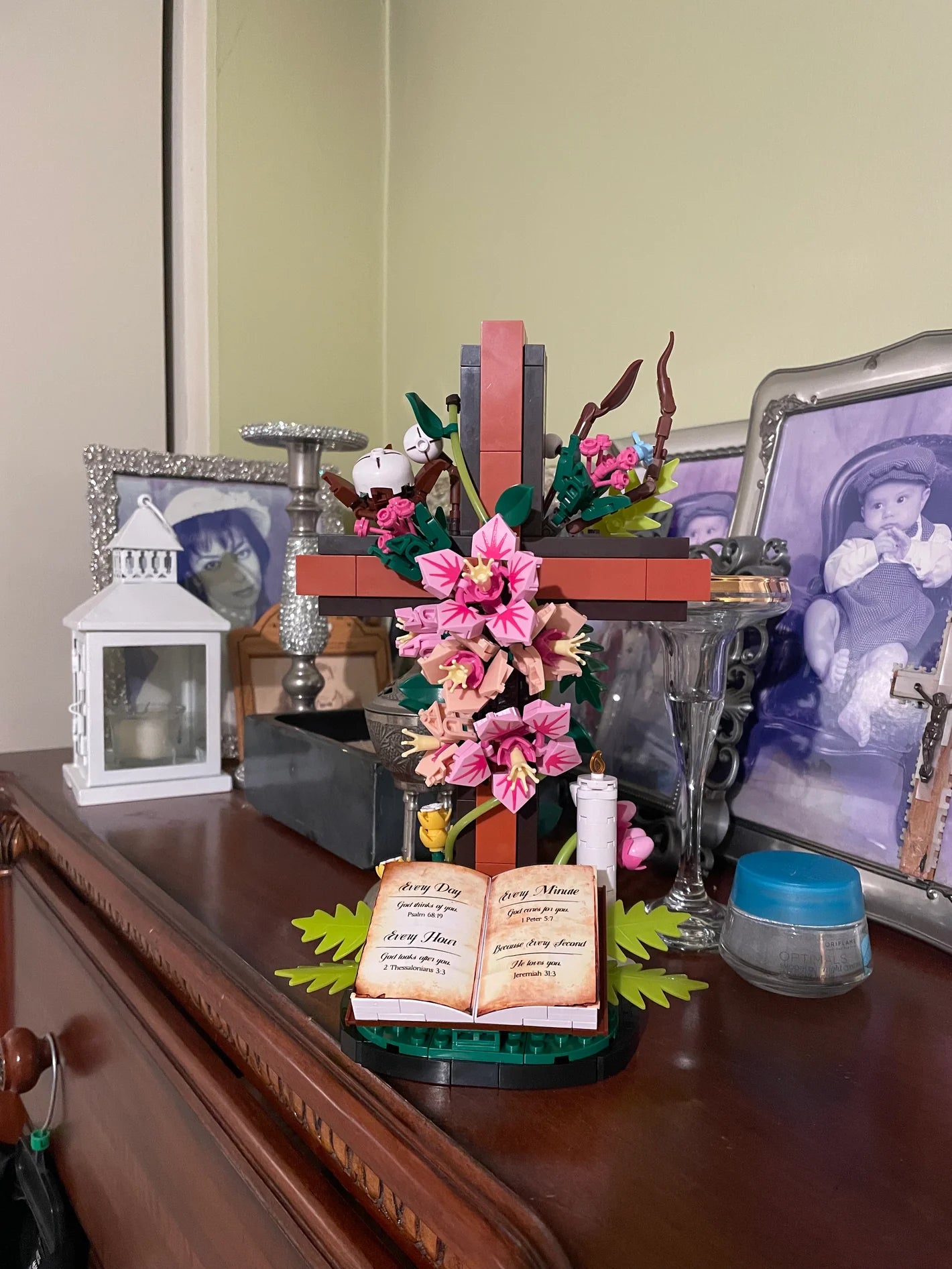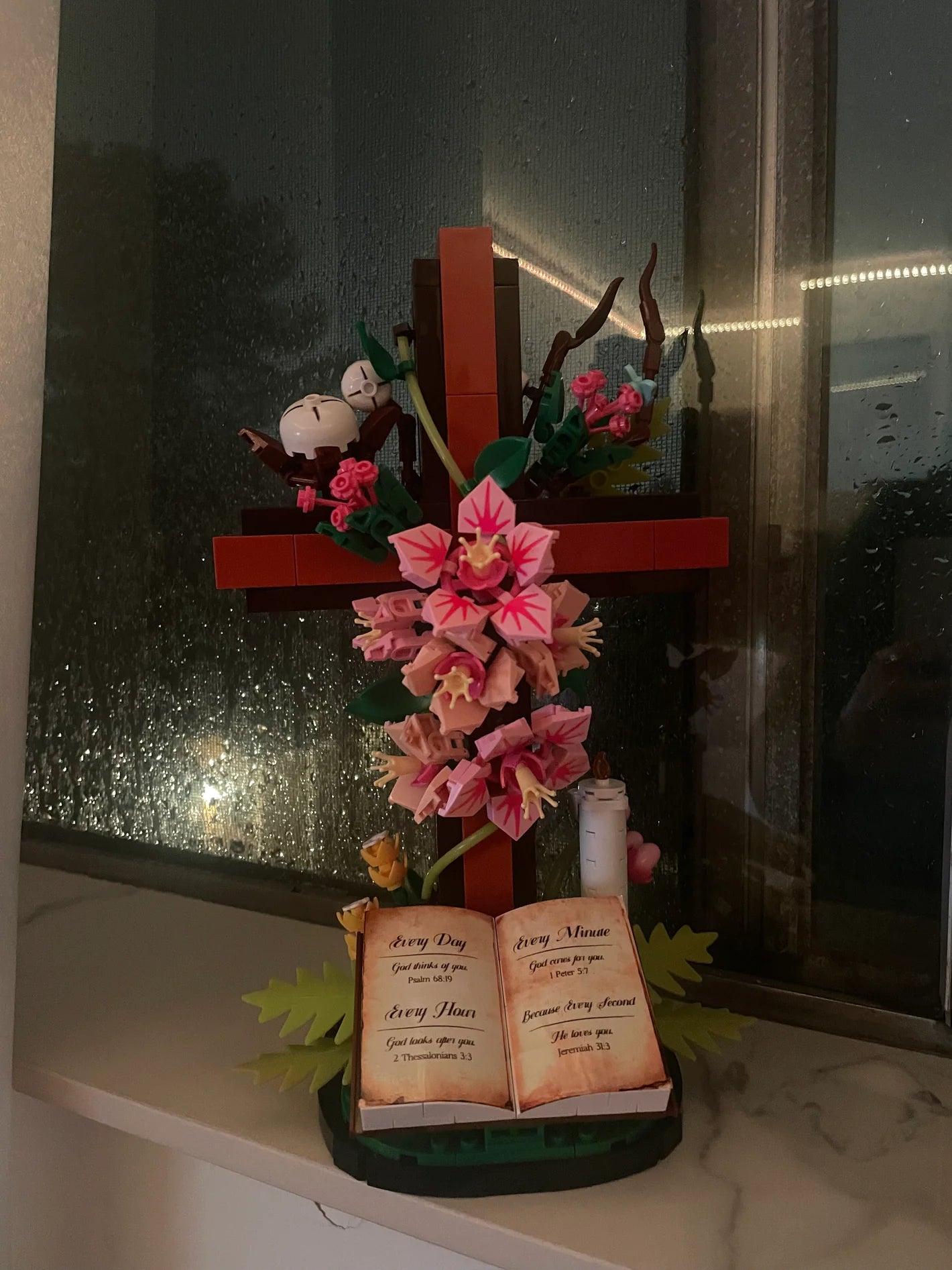 - This Cross and Holy Bible set of building blocks cleverly combines a cross with flowers. Kapok flowers, dogwood blossoms, olive branches, and other flowers surround the cross, symbolizing people's unwavering faith and hope for peace. This collectible building block model seamlessly blends faith, art, and creative construction. It's more than just a toy; it's a profound work of art.